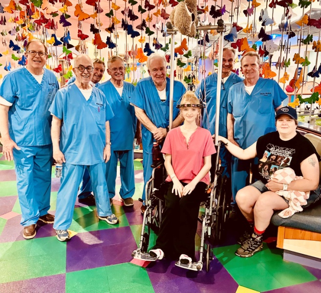 This very brave young lady was going through her second spine operation for scoliosis. I had the same exact operation 40-years ago, and so the connection was made. As we discussed what we both went through, the similarities were astounding. Her first operation was to stretch the spine through use of a halo; then a second operation a week later to fuse the rods to her spine. Mine was a bit different, as I had one long implant along the spine. She’ll have several. Just as painful, regardless.