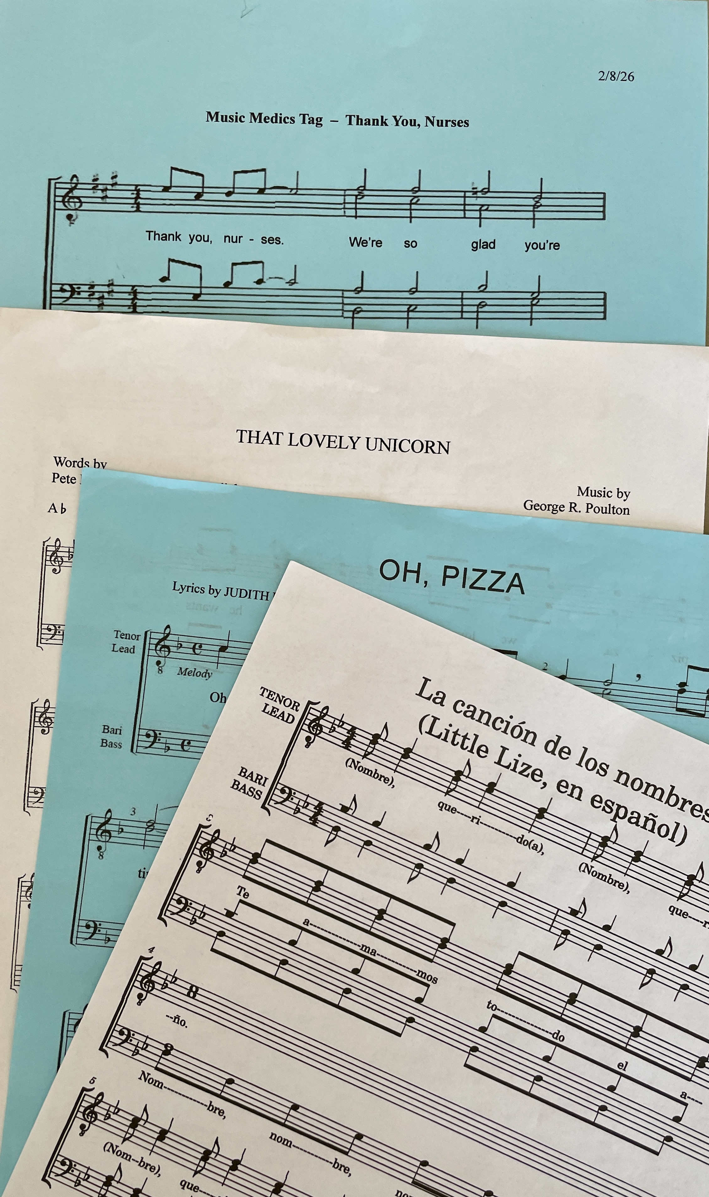We have expanded our repertoire to include more children-friendly songs using HI, the Human Intelligence of some of our members. Tenor Pete collaborated with a friend to compose The Lovely Unicorn (sung to the tune of Auralee). Lead Judy turned Oh Shenandoah into a soon-to-be classic, Oh, Pizza. (Keep an eye on the Billboard Charts!) Baritone/Tenor Gerald re-imagined the BHS tag, Cheer Up, Charlie as Thank You, Nurses. And baritone Leslie came up with a Spanish version of what we call The NameSong (Honey/Little Lize) that delights the many Spanish-speaking families whom we encounter.